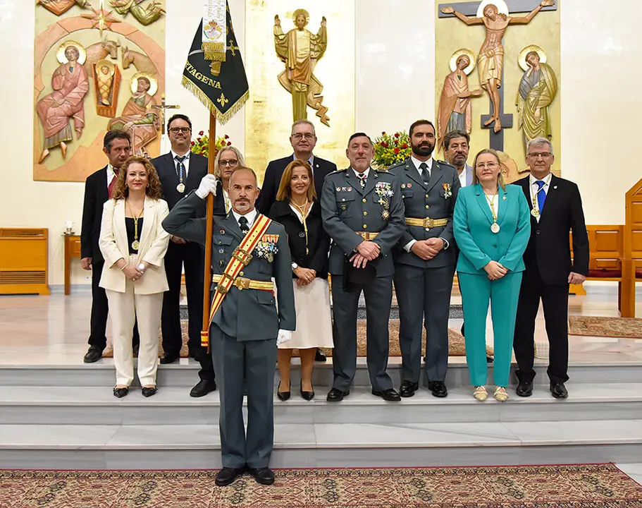 EN LA FESTIVIDAD DEL LA VIRGEN DEL PILAR EN LA PARROAQUIA DE SAN FULGENCIO EN CARTAGENA, LA COFRADIA DEL SANTISIMO CRISTO DE LA RESURRECCIÓN ENTREGA UN CORBATÍN DE DICHA COFRADIA A LA GUARDIA CIVIL.