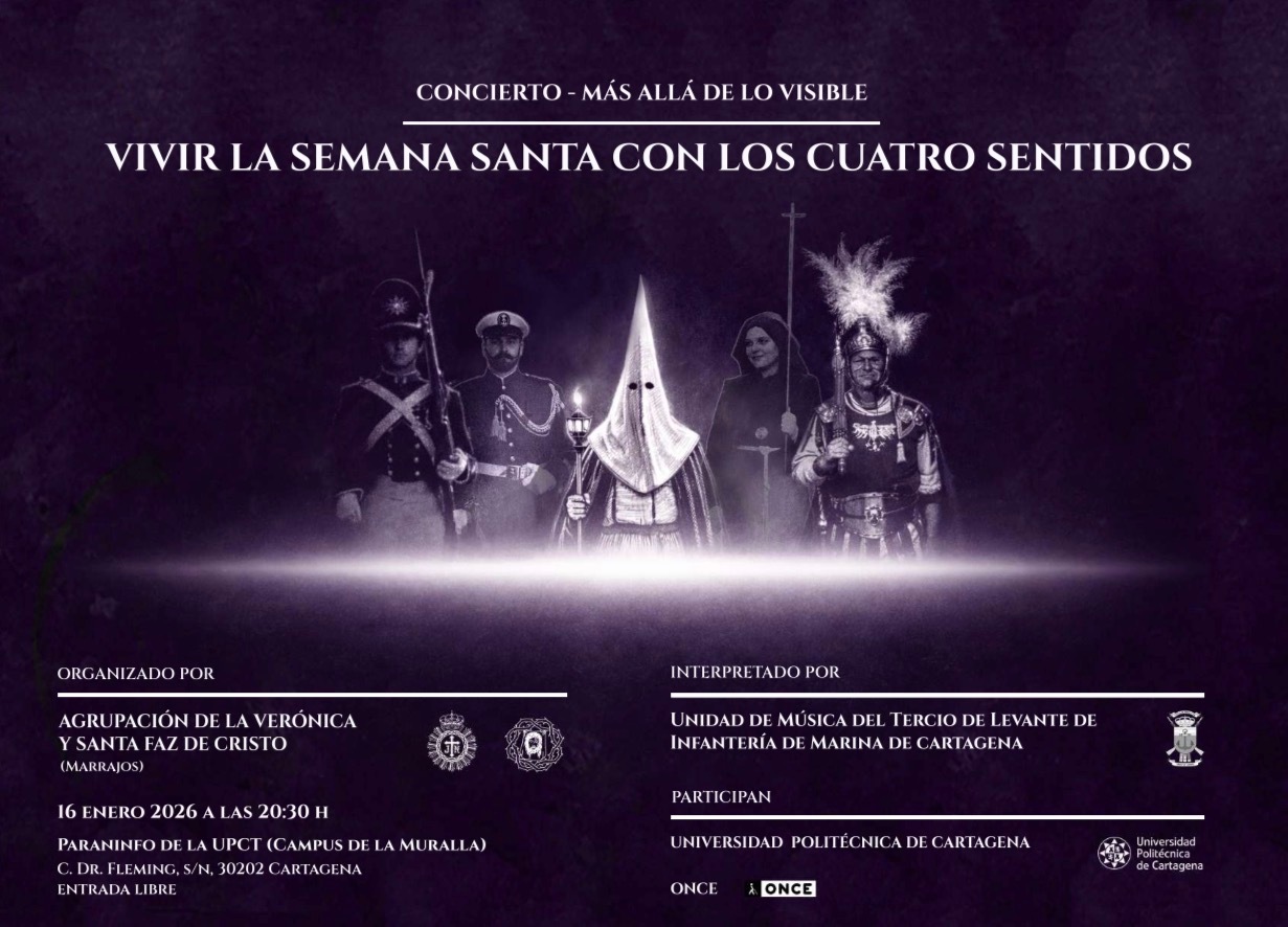 Cartagena, 14 de enero de 2026.- El próximo viernes 16 de enero de 2026, a las 20:30 horas, el Paraninfo de la Universidad Politécnica de Cartagena (Campus de la Muralla) acogerá un concierto más allá de lo visible. “Vivir la Semana Santa con los cuatro sentidos”, una propuesta cultural y sensorial que invita al público a experimentar la Semana Santa cartagenera desde una perspectiva innovadora y profundamente emotiva.