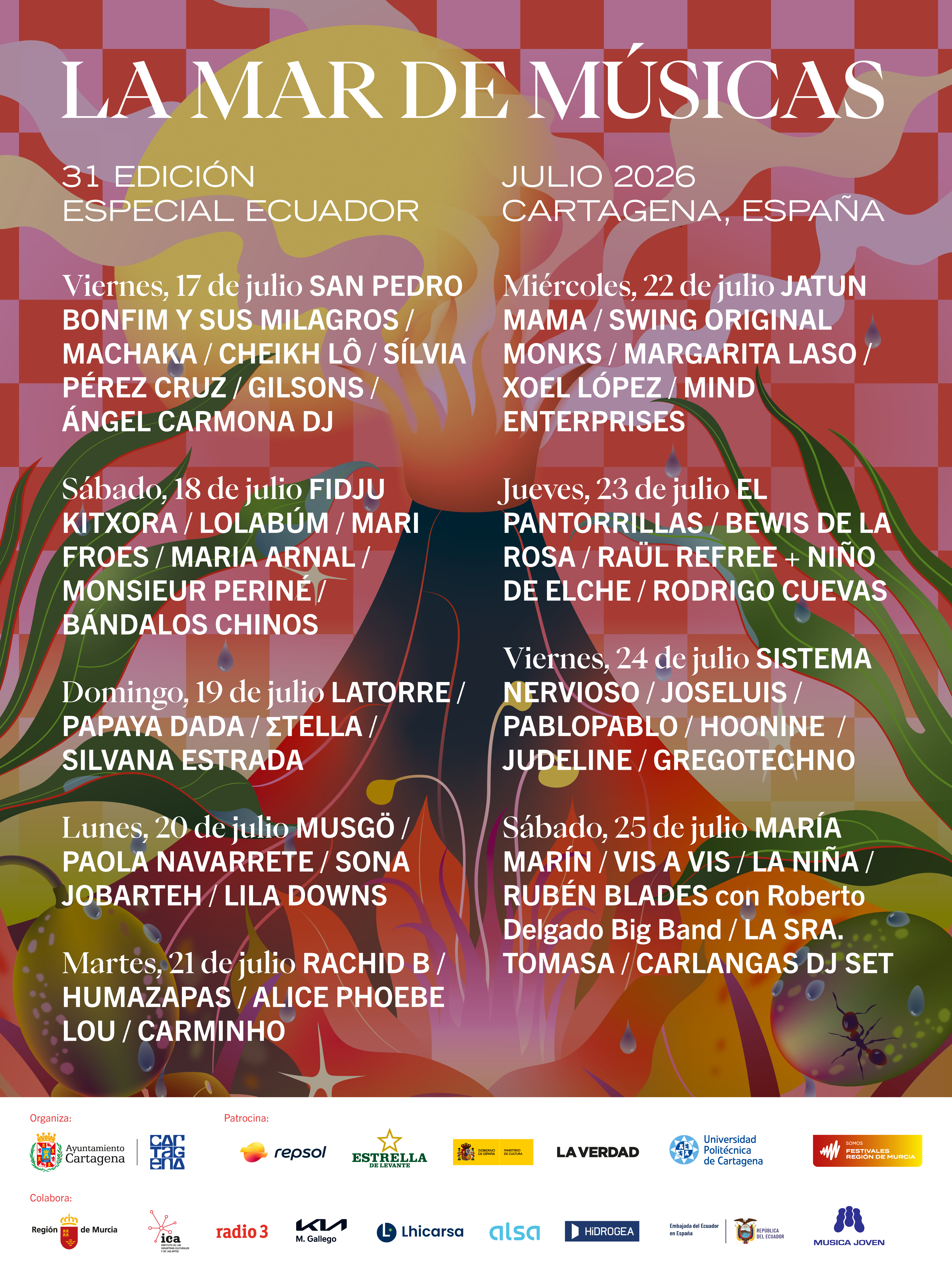 El festival La Mar de Músicas 2026 volverá a convertir a Cartagena en epicentro de la música internacional del 17 al 25 de julio, con una programación que reunirá a grandes nombres como Sílvia Pérez Cruz, Rubén Blades, Judeline, Lila Downs o Rodrigo Cuevas.
