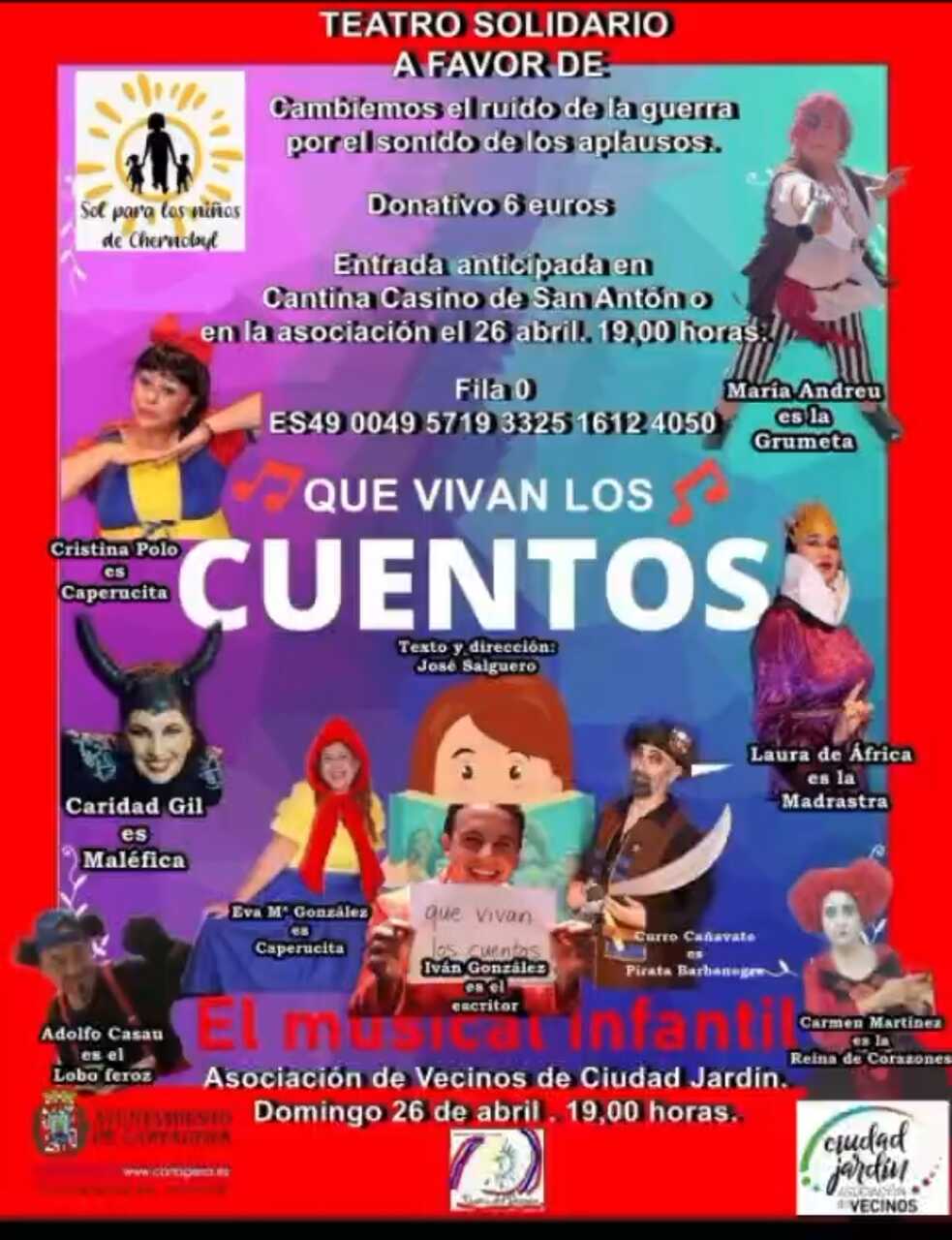 La solidaridad y la cultura se darán la mano este domingo 26 de abril en Cartagena con la representación teatral benéfica “¡Que vivan los cuentos!”, una iniciativa destinada a apoyar a los niños afectados por la guerra en Chernóbil.