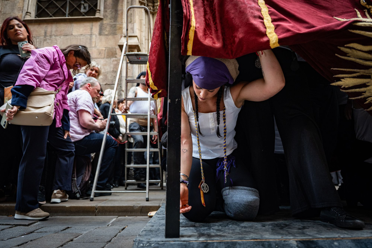 - Cultura y Espectáculos. Barcelona, 18/04/2025. Una costalera participa en la procesión de Viernes Santo desde la parroquia de San Jaime.