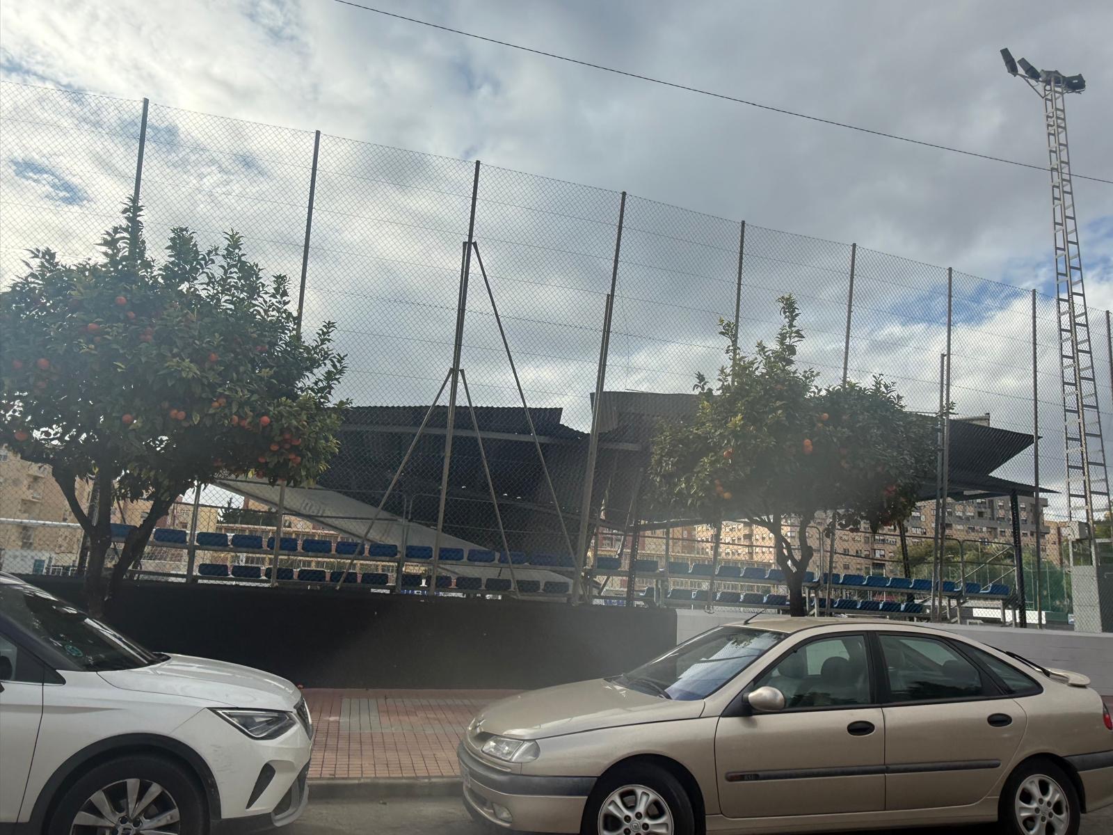 El fuerte viento derrumba la cubierta de la grada de Ciudad Jardín y caída de árboles