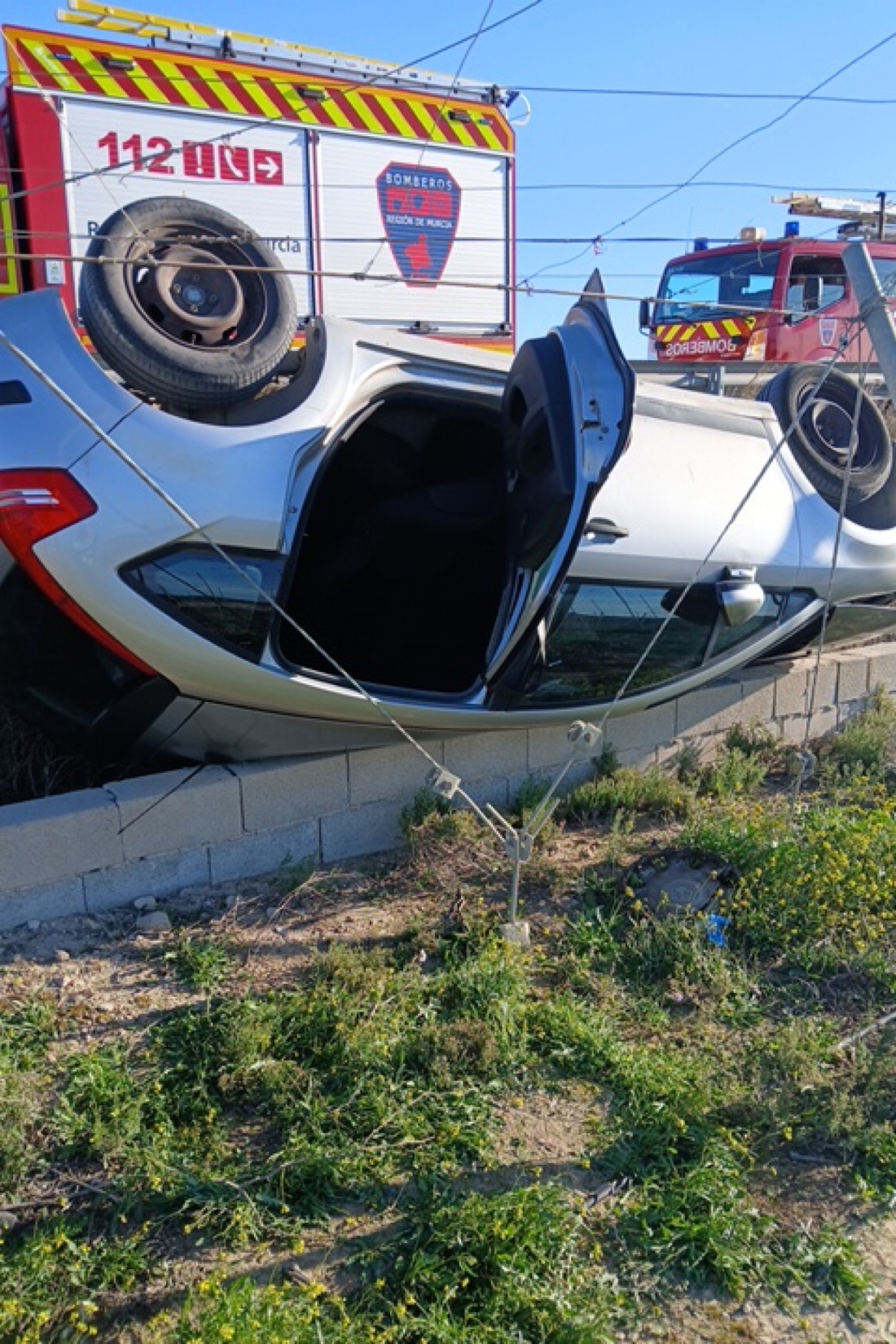 A las 9:44 horas de esta mañana, una llamada al Centro de Coordinación de Emergencias 1-1-2 alertaba de un accidente de tráfico ocurrido en el Camino de las Cabezuelas, en el término municipal de Alhama de Murcia. Un vehículo se había salido de la calzada y había quedado volcado sobre uno de sus laterales, con su conductor atrapado en el interior.