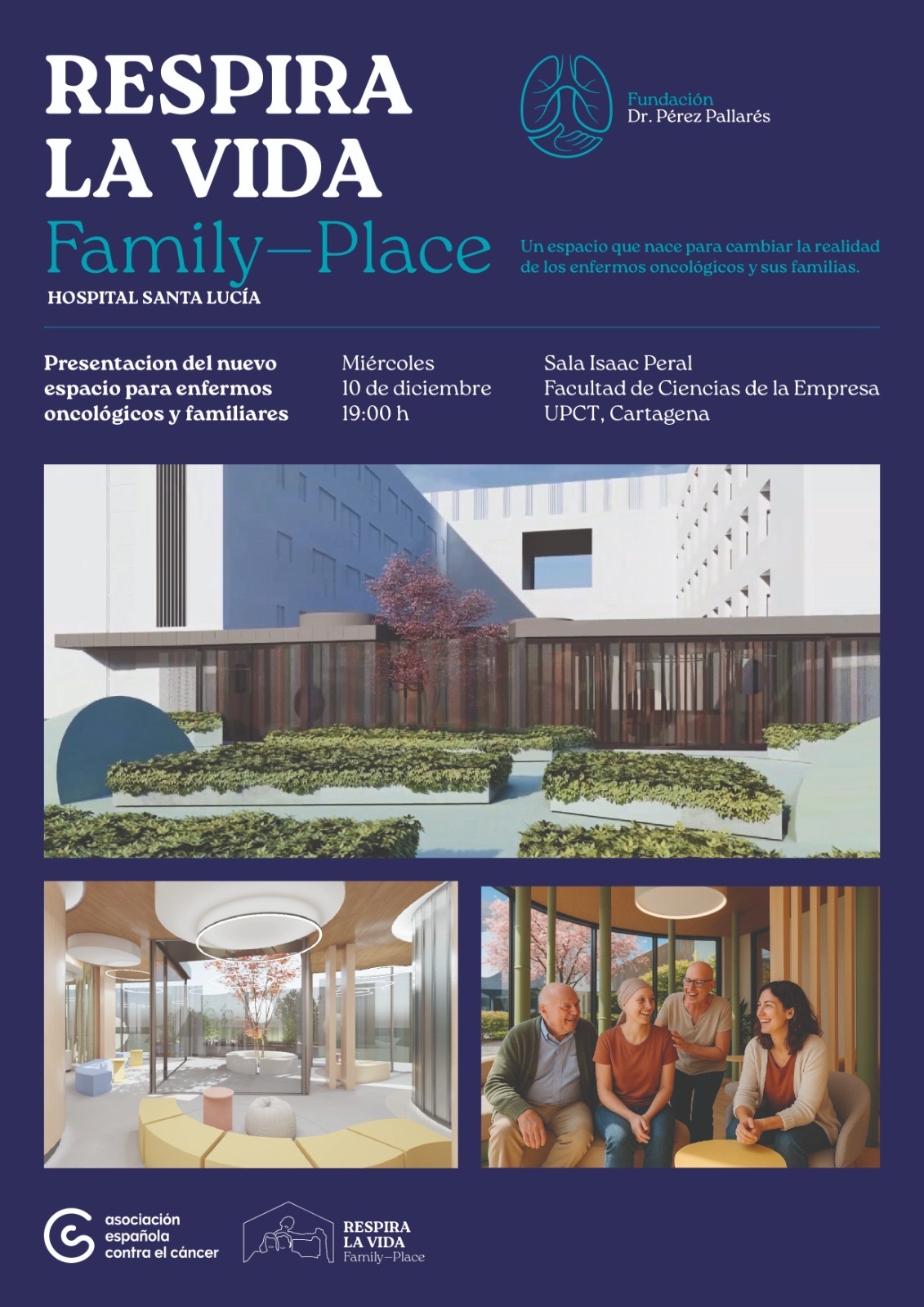 Mañana miércoles 10 de diciembre se presentará públicamente ‘Respira la vida-Family Place’, el primer espacio oncológico humanizado de acompañamiento emocional financiado íntegramente por la ciudadanía en España. El acto se celebrará a las 19:00 horas en la Sala Isaac Peral de la Facultad de Ciencias de la Empresa de la UPCT. El proyecto es una iniciativa de la Fundación Dr. Pérez Pallarés.