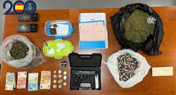Tras constatar la actividad ilícita, el posterior registro permitió intervenir 700 gramos de hachís, 600 gramos de marihuana, 33 gramos de cocaína en dosis predispuestas para su distribución así como 500 euros efectivo, un arma de fogueo y un cargador con un cartucho entre otros efectos.