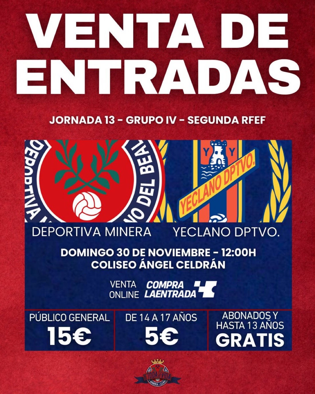 TERRITORIO MINERA 2RFEF....Otro derbi regional para cerrar el mes de Noviembre en el CELDRAN...La MINERA con malos resultados mala suerte con las decisiones arbitrales y 1 punto de 15...que tienen que acabarse ya el domingo recibiendo al YECLANO ... Décimo con 15 puntos y que fuera de su campo de la CONSTITUCIÓN...ha jugado 6 partidos con solo una victoria en ESTEPONA y un empate en la VIEJA CONDOMINA contra el UCAM...Esperamos como siempre y el domingo más el apoyo de la afición MINERICA ... porque la situación clasificatoria es preocupante ...y una victoria haría mucho bien para todos...y el apoyo al PRESIDENTE BLAYA ahora es muy necesario...para este bonito derbi contra los amigos del YECLANO ...ha sido designado el colegiado Valenciano Javier Villaescusa Alarcón de 29 años y natural de Requena...cumple su cuarta temporada en 2 RFEF ...con 42 partidos dirigidos 24 VL 10 E 8 VV..147 amarillas y 9 rojas ...su arbitraje se caracteriza por dejar jugar ...usar poco las tarjetas...y algo caserillo....esperemos tenga una buena actuación y que si se equivoca sea a favor de la minera....de informador arbitral estará el murciano PEDRO TRISTANTE MENOR....hijo del legendario DIN PEDRO TRISTANTE OLIVA ....JPLP PARA CARTAGENA ACTUALIDAD