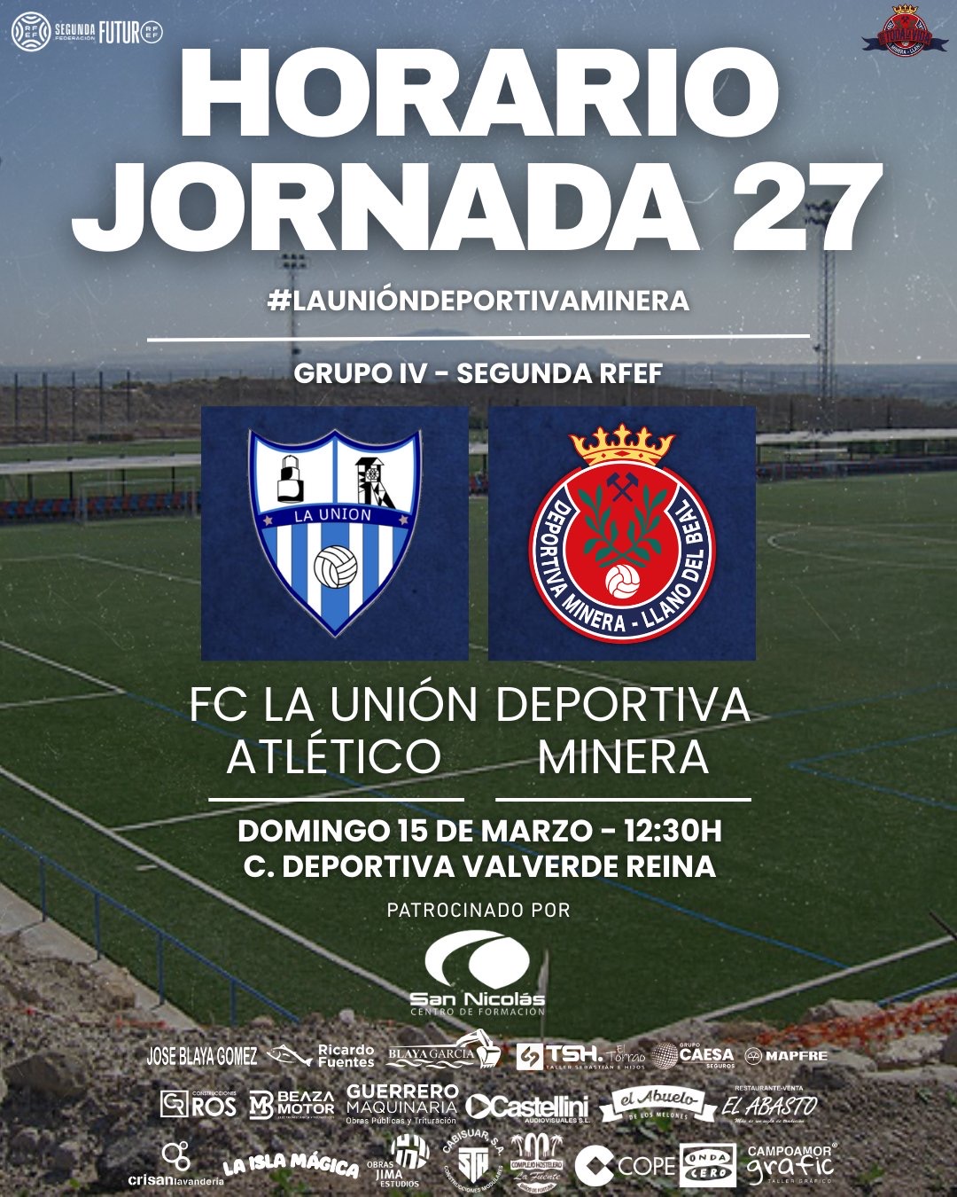 TERRITORIO LOCAL 2RFEF MINERA.... Partido interesante de esta jornada 27 de este complejo grupo cuarto donde lo que sería un DERBI MINERO ...quedó atrás por los intereses que a veces reinan en el fútbol...Se jugará en Totana ...este LA UNION AT -MINERA ...que ya es todavía más noticia por el gesto de la plantilla MINERICA...que va a pagar las 80 entradas facilitadas por los locales para la afición de la Minera....bonito gesto y muestra la comunicación de todos los miembros del club presidido por JOSE BLAYA ... volviendo al partido será arbitrado por el ilicitano recién ascendido y debutante con los dos equipos de 25 años... ALEJANDRO MARTÍNEZ IBAÑEZ...11 partidos 7 VL 1e 3 VV... mostrando 56 amarillas y 1roja ....La Unión rompió una racha de mes y medio sin ganar ...consi peor racha ...pero viene de ganar en partido en su día aplazado ...Linares 0-2 La Unión...que le sitúa noveno con 36 puntos...De La MINERA a seguir sumando para no salir de ese quinto puesto de promoción de ascenso y ser más regular tras dos victorias y dos derrotas ....pero siendo el mejor de las últimas 10 jornadas