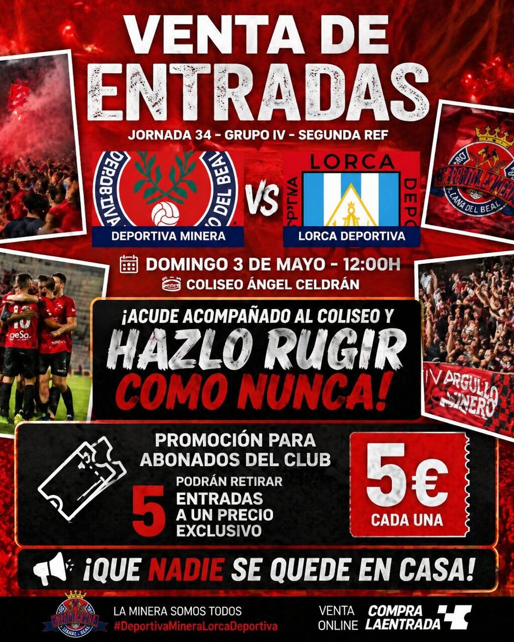 La Deportiva Minera ha puesto en marcha una atractiva campaña para movilizar a su afición de cara al importante encuentro que disputará este domingo 3 de mayo ante el Lorca Deportiva, correspondiente a la jornada 34 del Grupo IV de Segunda RFEF y donde podría subir a 1 RFEF en caso de victoria y no ganase el Extremadura en Linares