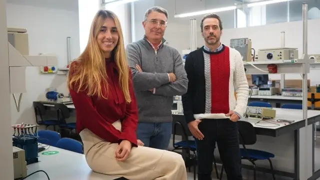 Imágenes adjuntas de Adelaida Parreño en un laboratorio de Ingeniería Eléctrica de la UPCT con y sin sus directores de tesis.
