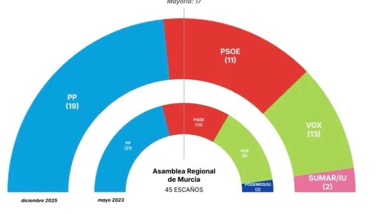 El PP ganaría las elecciones autonómicas, pero bajaría 2 diputados ,mientras VOX subiría 4, según el Observatorio Español de Estudios Demoscópicos UCAM Redacción 16/dic/2025
